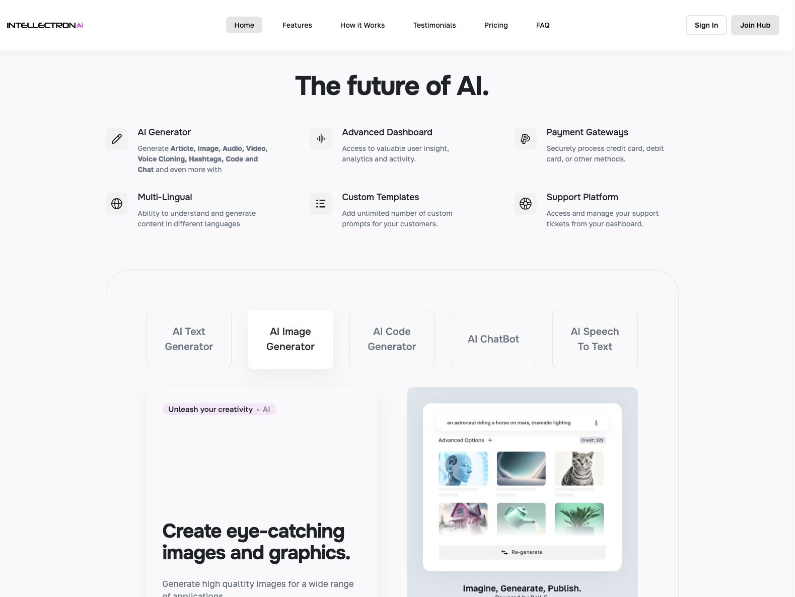 IntellectronAI is a powerful SaaS platform that allows create your AI SaaS Business in just minutes. Your subscribers will be able to use sophisticated OpenAI Artificial Intelligence technology to generate various Text Contents, Blog Posts, Long Articles, Ads, Media Content and so much more in more than 40+ languages using latest GPT-3.5-Turbo, GPT-4, GPT-4o models. Potentials of what your subscribers can generate is basically endless.